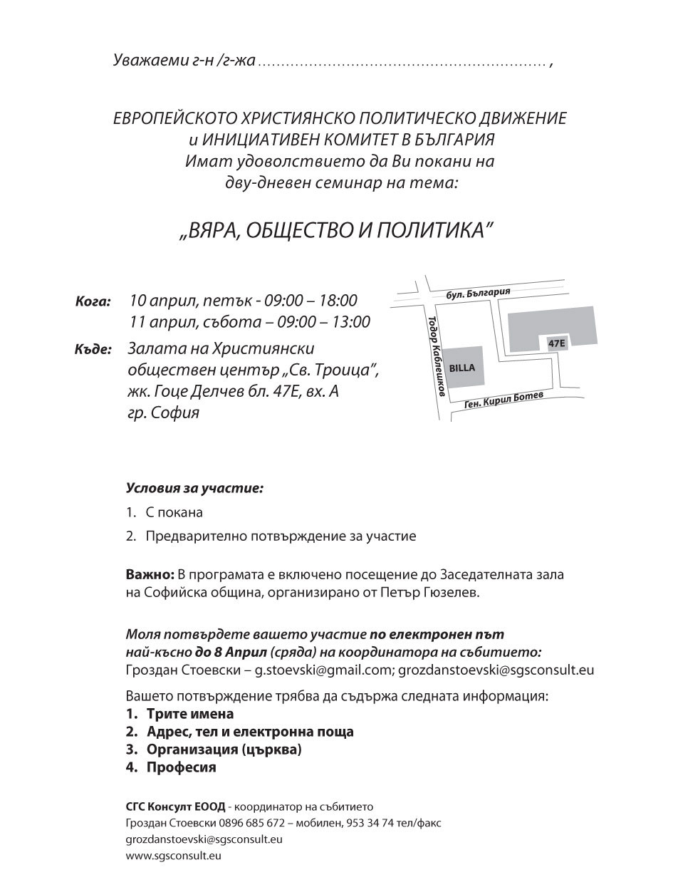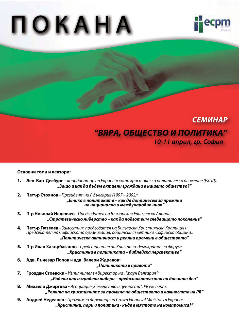 Европейското Християнско Политическо Движение и Инициативен Комитет в България ви канят на дву-дневен семинар на тема "Вяра, общество и политика".